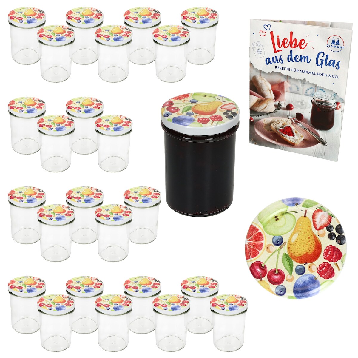25er Set Sturzglas 230ml HOCH Einmachglas TO66 Comic-Obst Deckel Rezept-Heft