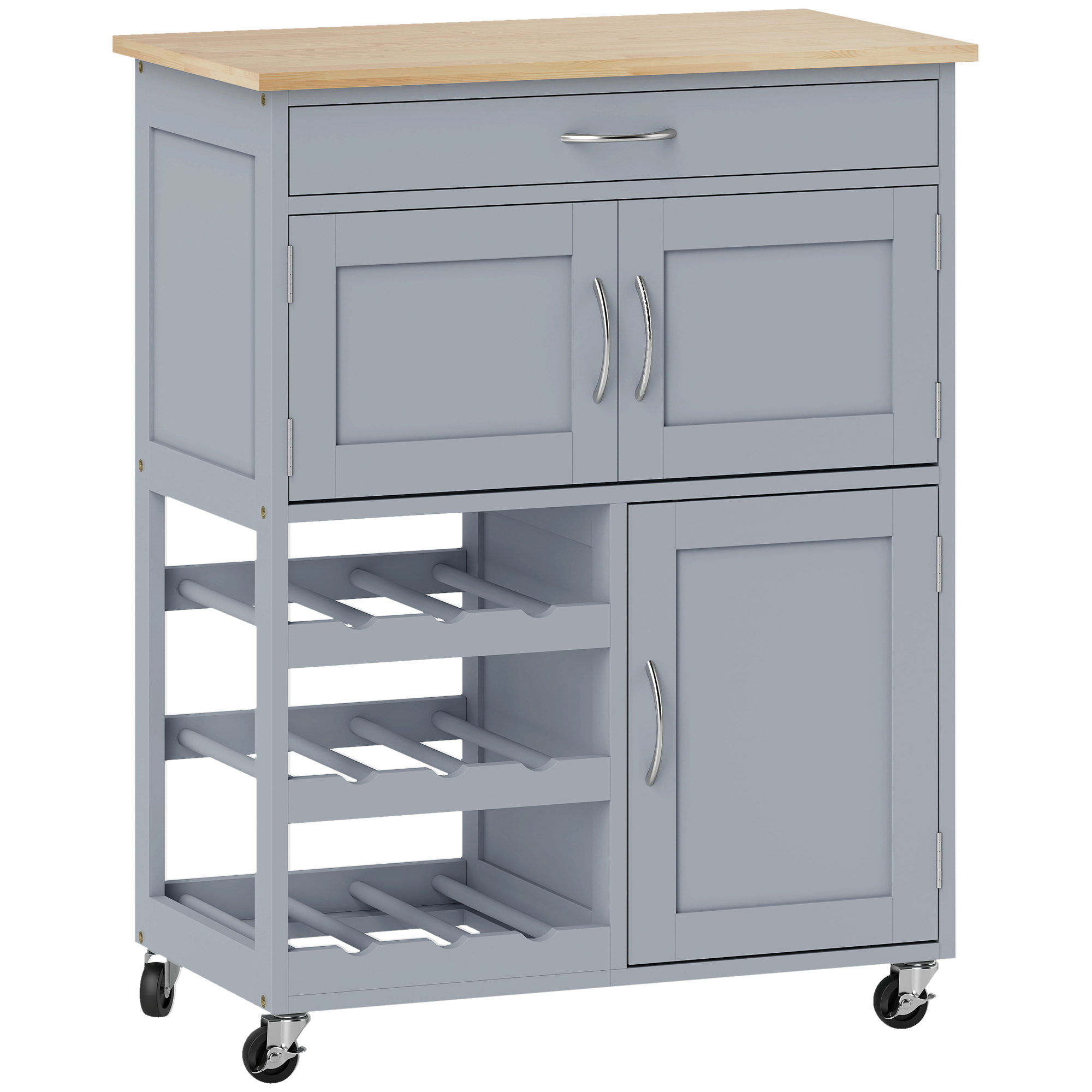 HOMCOM Modern Kitchen Trolley, Rolling Island Storage Cart with Drawer, 9-bottle Wine Rack, Door Cabinets, Wooden Countertop, Grey