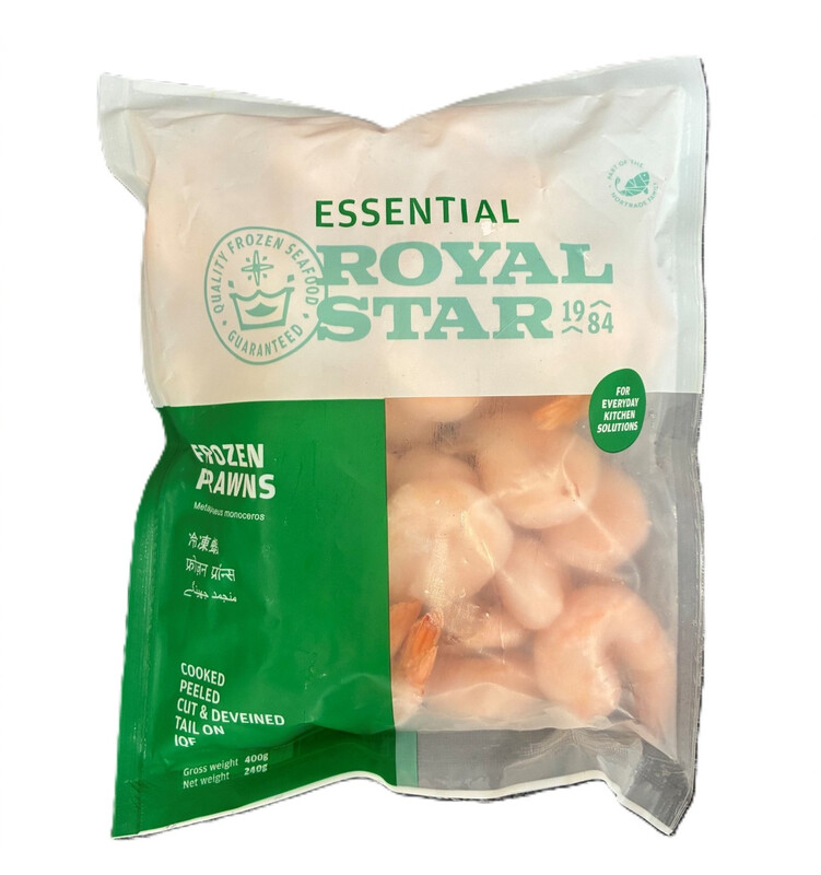 ESSENTIAL ROYAL STAR Cooked Peeled Tail On IQF 31/40 Medium Prawns 400g (240g net)