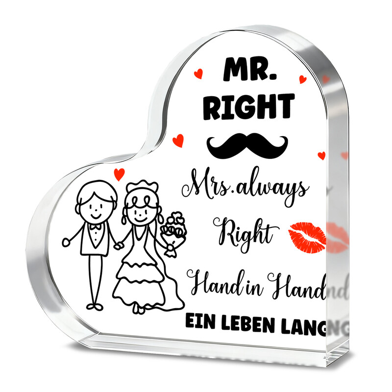 Alphynix 1 Stück bilinguale Liebesurkunde „Mr. Right & Mrs. Always Right“, Kristall-Geschenk mit Hochzeitspaar-Silhouettenmotiv, „EIN LEBEN LANGE“ romantischer deutscher Spruch