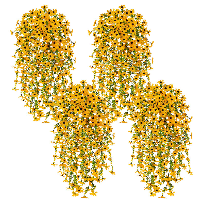 4Pcs 28.7in/72.8cm Artificial Hanging Flowers for Outdoors Fake Plants Decoration,Faux Silk Colorful Daisy Eucalyptus Realistic for Outside Home Planter Porch Patio Yard Decor(yellow)