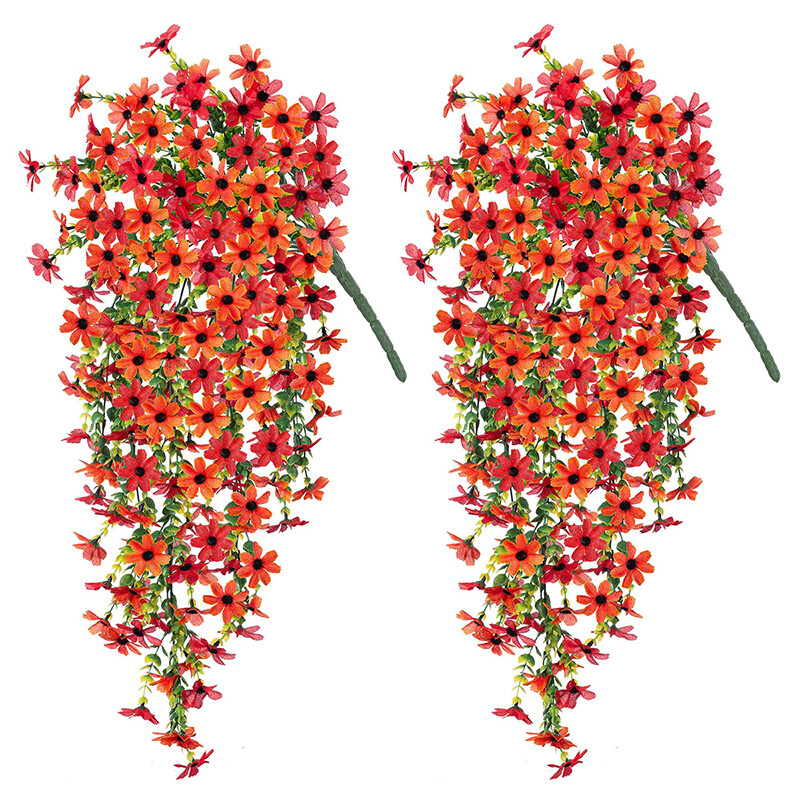 4Pcs 28.7in/72.8cm Artificial Hanging Flowers for Outdoors Fake Plants Decoration,Faux Silk Colorful Daisy Eucalyptus Realistic for Outside Home Planter Porch Patio Yard Decor(orange&red)