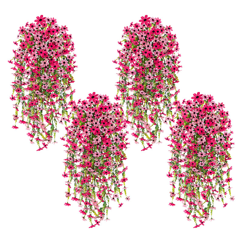 4Pcs 28.7in/72.8cm Artificial Hanging Flowers for Outdoors Fake Plants Decoration,Faux Silk Colorful Daisy Eucalyptus Realistic for Outside Home Planter Porch Patio Yard Decor(pink&rose red)