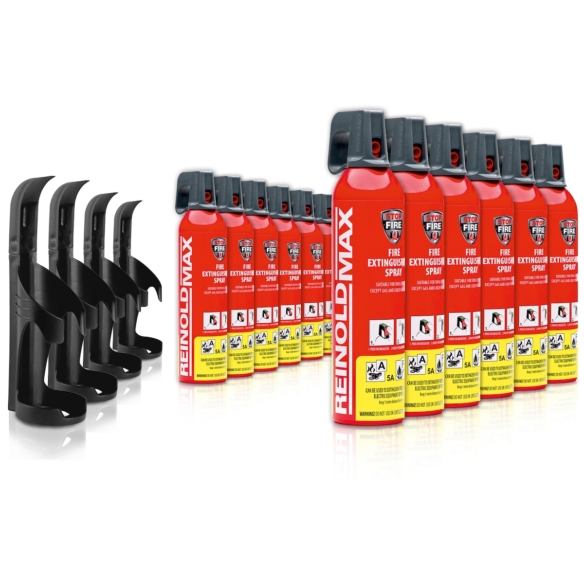 XENOTEC Premium Feuerlöschspray–12 x 750ml – Wandhalter - Stopfire – Autofeuerlöscher – REINOLDMAX – inkl. 4 Wandhalterung schwarz – wiederverwendbar