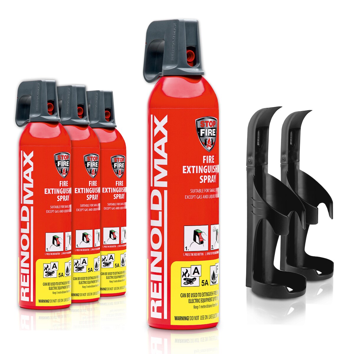 XENOTEC Premium Feuerlöschspray –4 x 750ml – Wandhalter - Stopfire – Autofeuerlöscher – REINOLDMAX – inkl. 2 Wandhalterung schwarz – wiederverwendbar