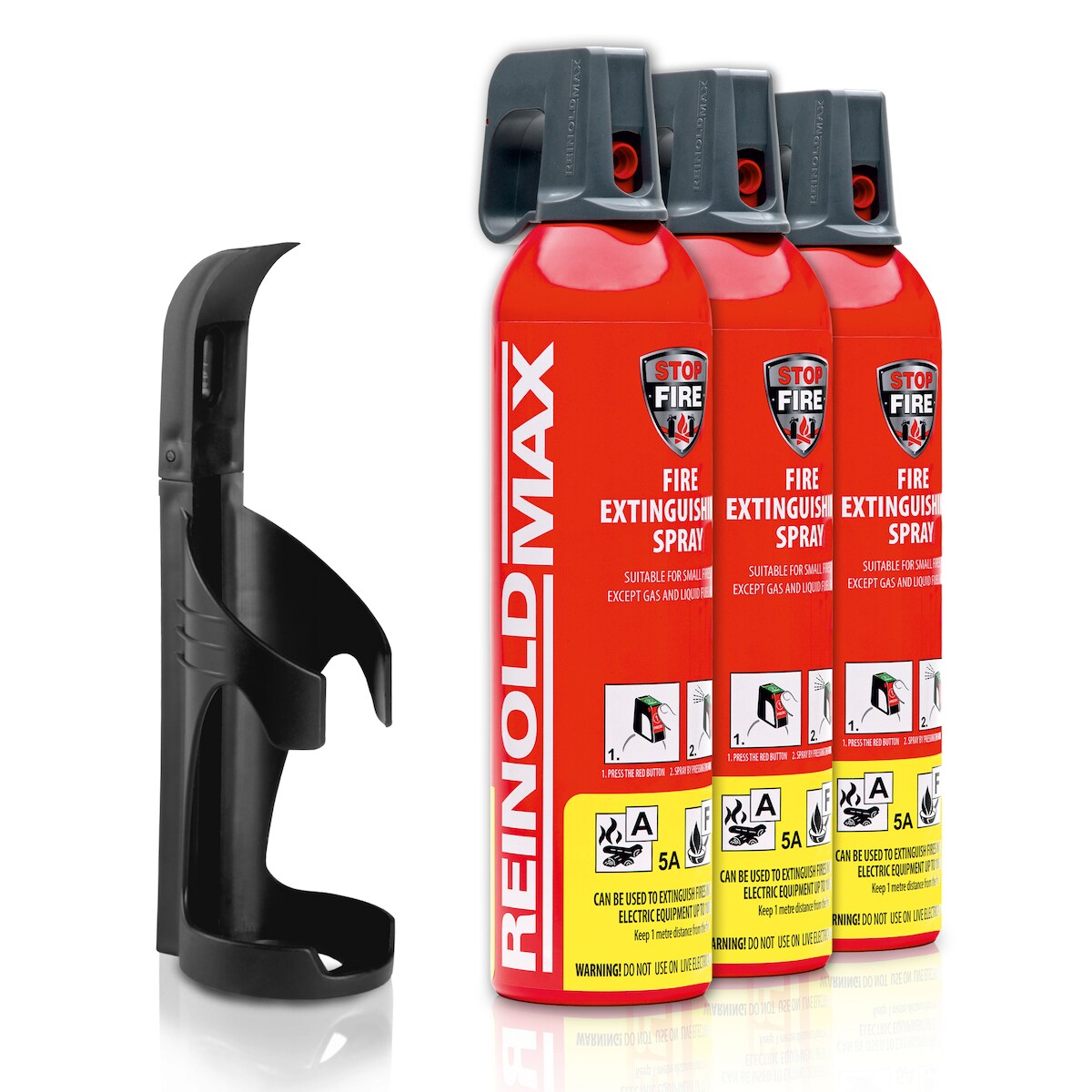 XENOTEC Premium Feuerlöschspray – 3 x 750ml – Wandhalter - Stopfire – Autofeuerlöscher – REINOLDMAX – inkl. 1 Wandhalterung schwarz – wiederverwendbar