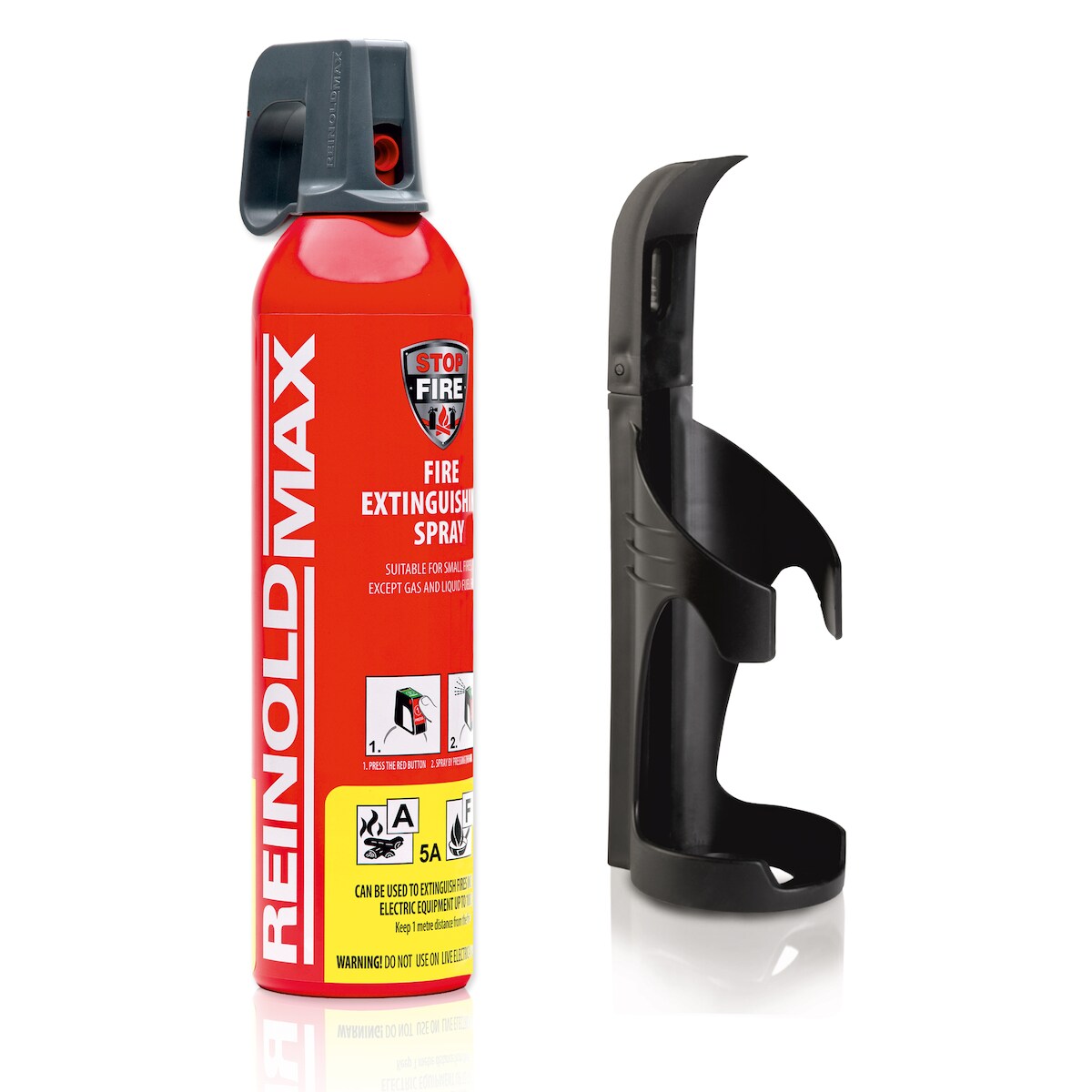 XENOTEC Premium Feuerlöschspray –1 x 750ml – Wandhalter - Stopfire – Autofeuerlöscher – REINOLDMAX – inkl. 1 Wandhalterung schwarz – wiederverwendbar