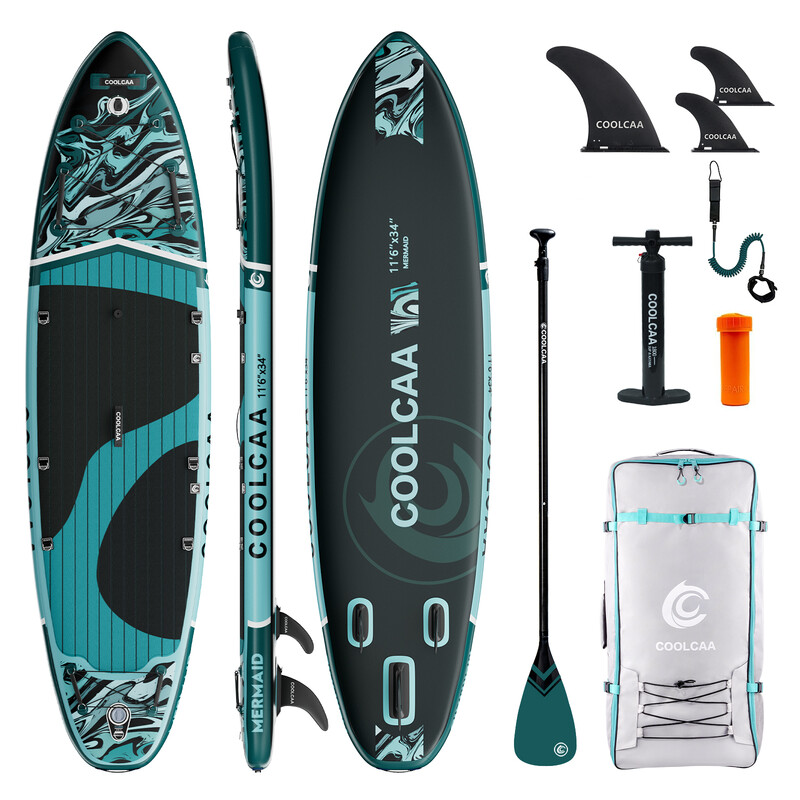 COOLCAA Série Sirène Paddle Board Gonflable Stand Up 11'6" avec Pagaie en Fibre de Verre (Noir & Vert)