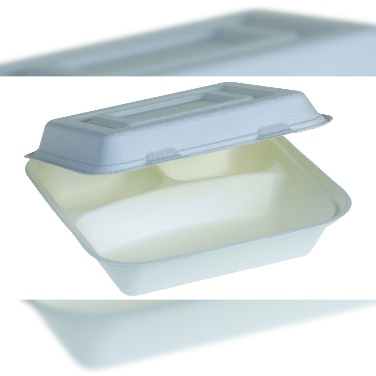 DeinPack Bio Einweg Bagasse Schalen 3-geteilt Klappdeckel-Box 1200 ml I 50 Menübox Einweg 236 x 231 x 81 mm weiß