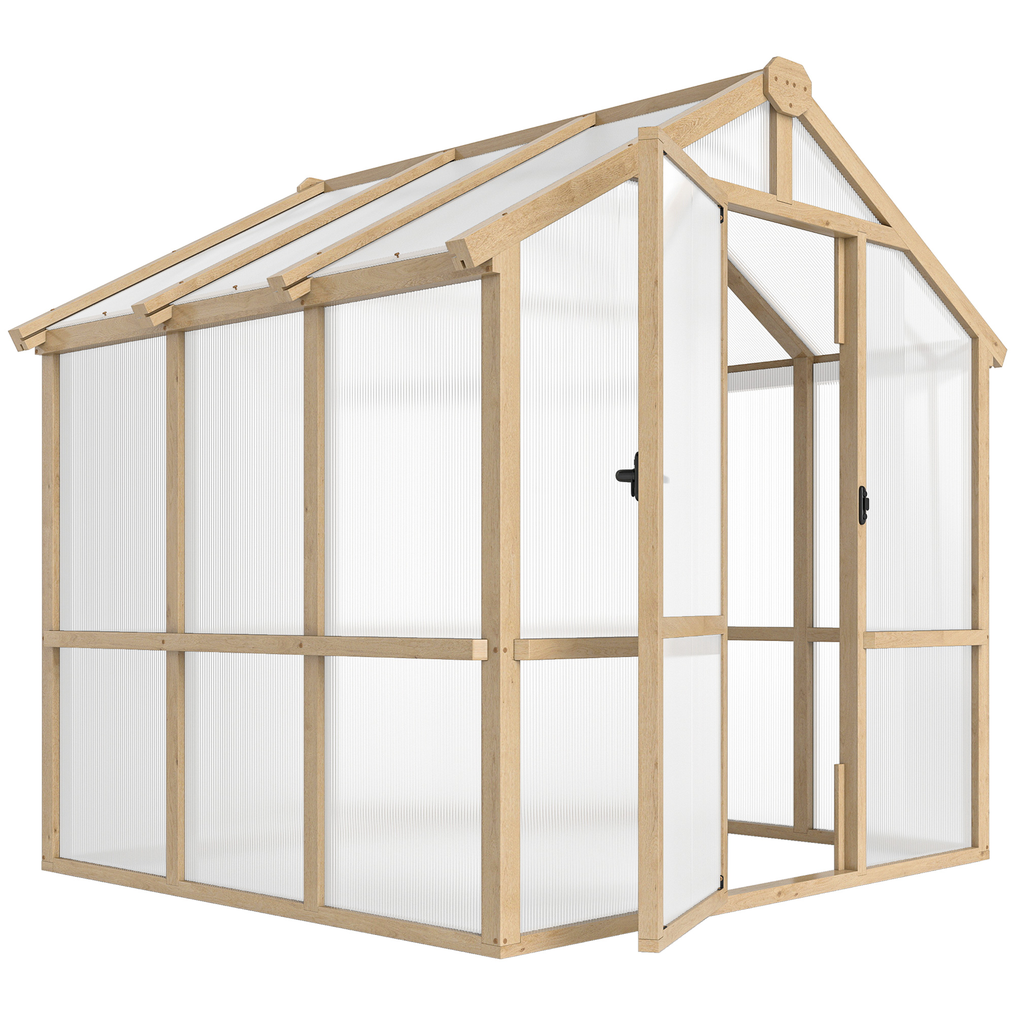 Outsunny 6.6 x 6ft Polycarbonate Greenhouse, Walk-in Wooden Greenhouse with Lockable Door and Window, Garden Plants Grow House, Brown