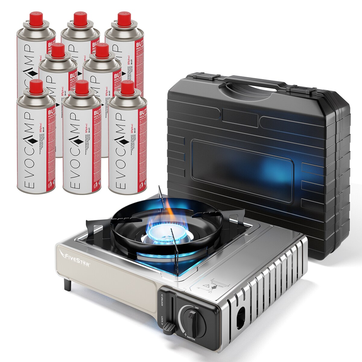 EVOCAMP Gaskocher faltbar mit 4x 227g Gaskartuschen inkl. Tragetasche, klappbar mit Piezozündung für Innen-/Außenbereich