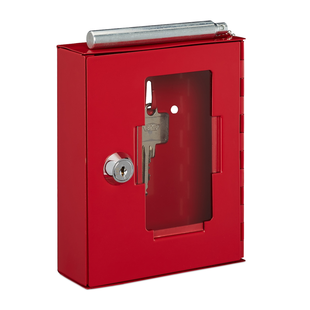Relaxdays Notschlüsselkasten mit Glasscheibe, Hammer & Schlüssel, abschließbar, Metall, Notschlüsselbox, Notkasten, rot