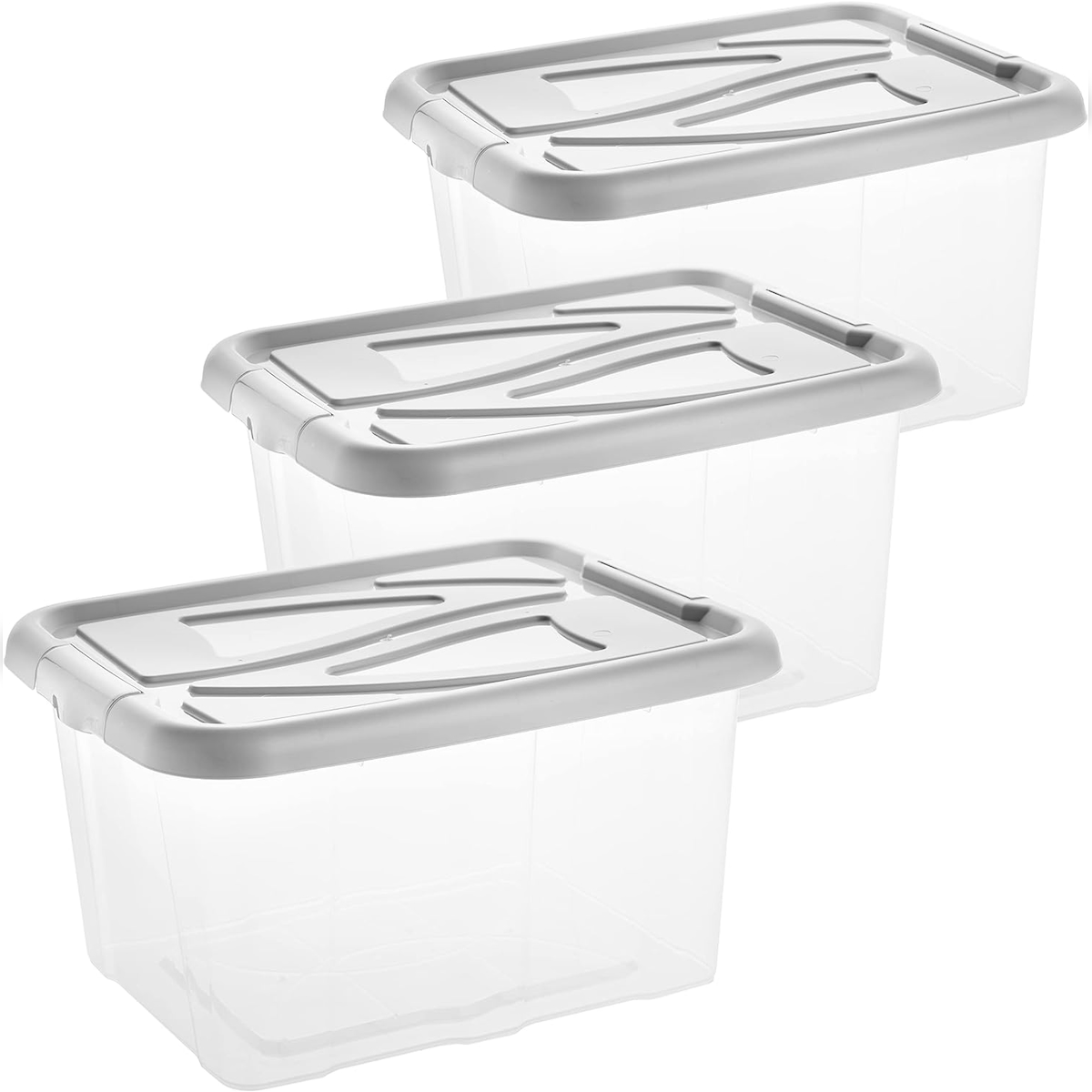 3er Set Aufbewahrungsbox mit Deckel Groß, 30 l Transparent, Deckel: Pastellgrau