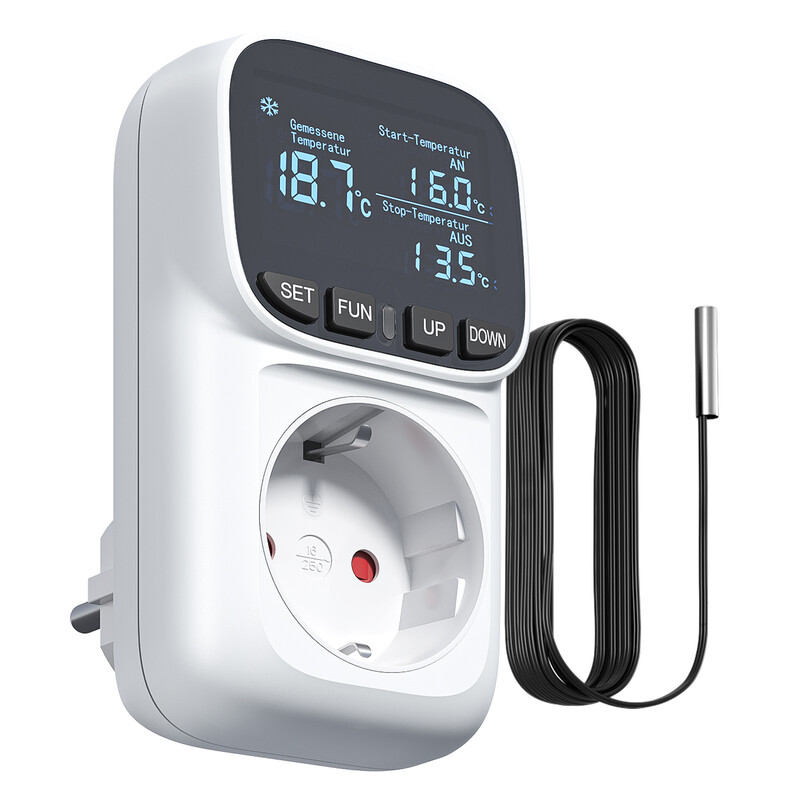 Dewenwils digitaler Thermostat-Steckdose, 230 V, mit Sensor, Heiz- & Kühlfunktion, deutsches Display, für Gewächshaus, Terrarium & Kühlschrank
