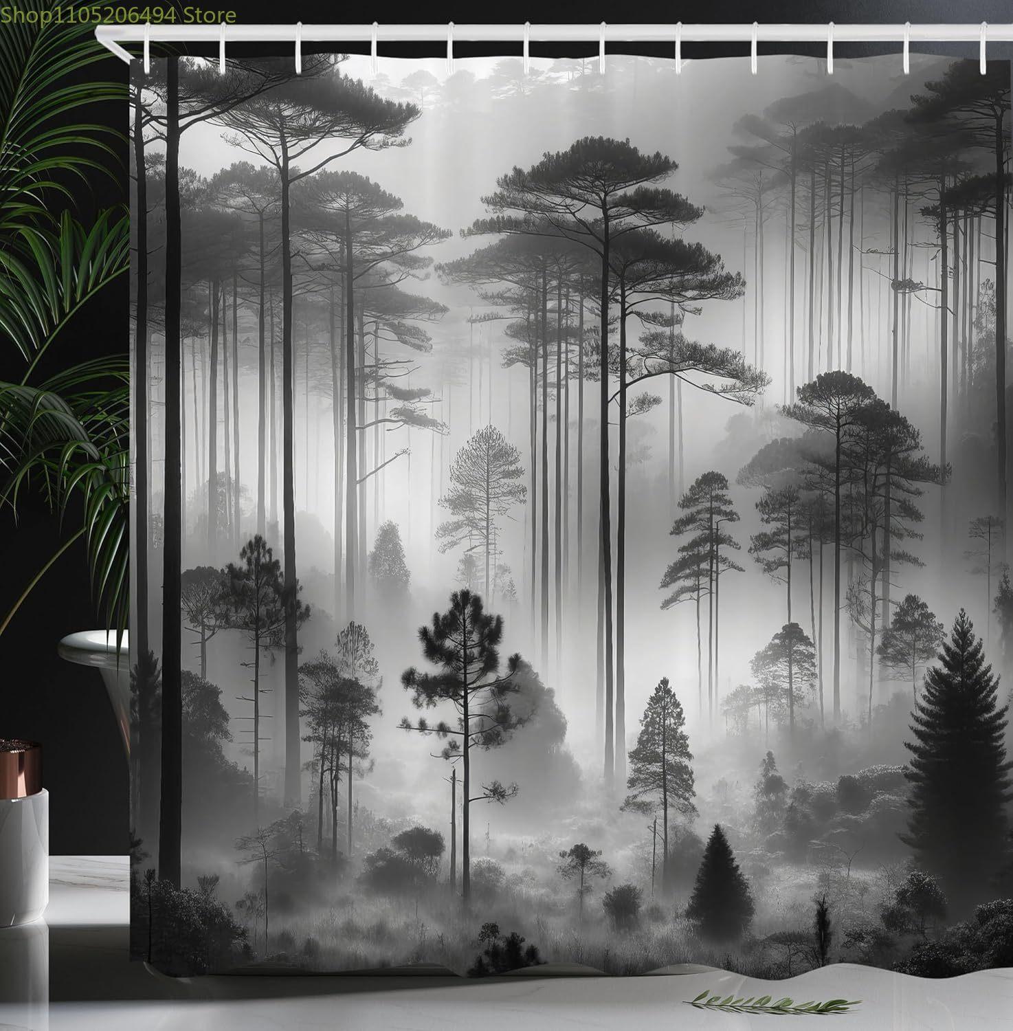 black and white shower curtain misty tall trees woodland natural landscape fabric bathroom decoration shower curtain with hook