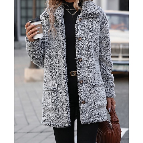 Per donna Cappotto Teddy Giacca Casual Caldo Confortevole Tasca Bottoni Casual Semplice All'aperto Vacanza Casa Uscire Regolare Collo ripiegato Vestibilità comoda Manica Lunga Capispalla Nero Caffè