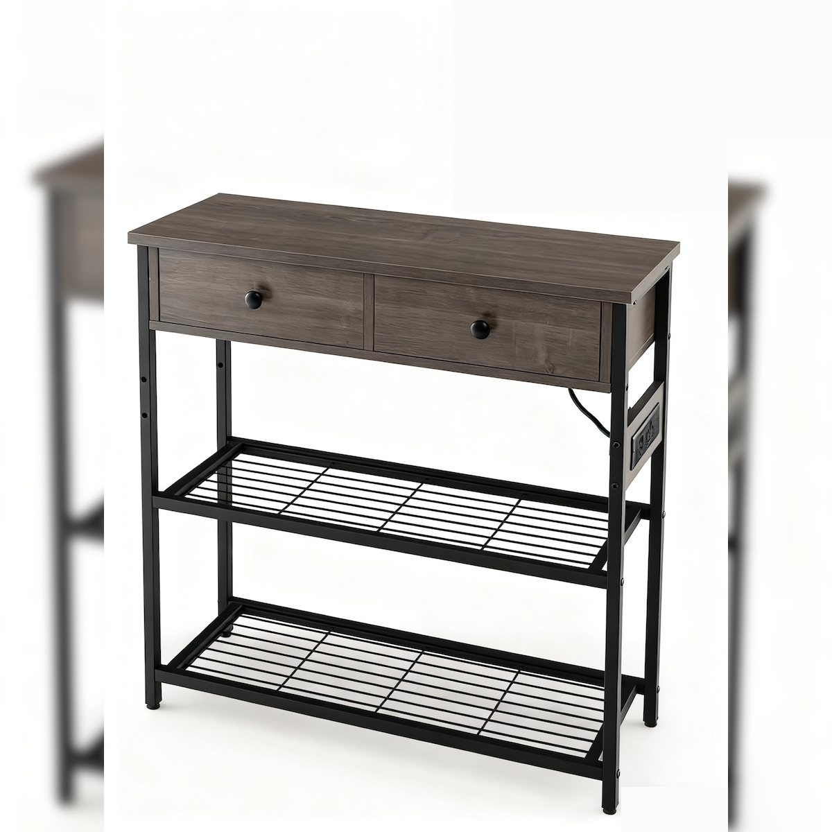 COSTWAY Konsoletisch mit Ladestation, Flurtisch mit 2 Schubladen & 2 Metallgitterregalen, mit Steckdosen & USB