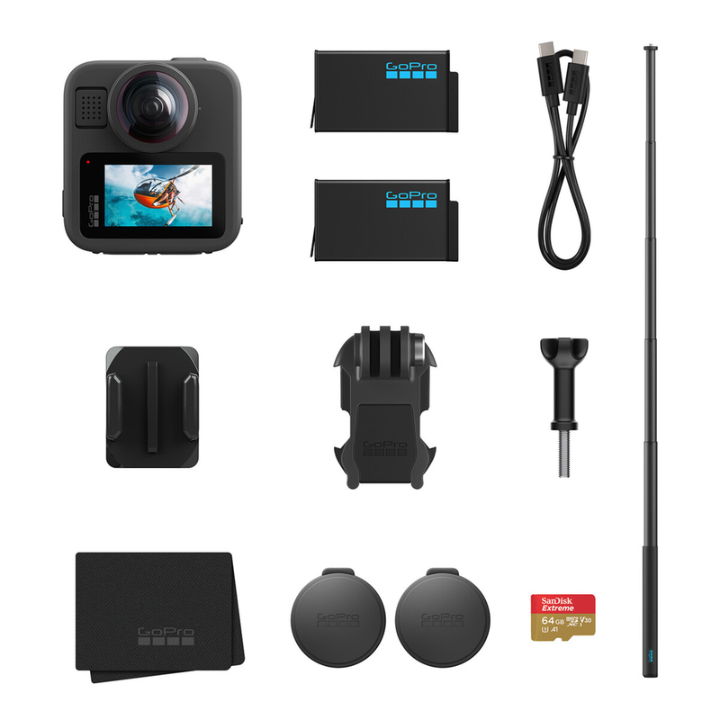 GoPro MAX2 + Zubehörpaket - enthält einen 1,2 m Verlängerungsstab, 2 Enduro-Akku (1960 mAh) und eine SanDisk MicroSD-Karte (64 GB)
