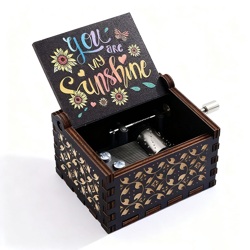 Alphynix Boîte à musique à manivelle vintage, 1 pièce, avec feuille musicale de « You Are My Sunshine » offerte, gravures de papillon et de motifs floraux, souvenir sentimental