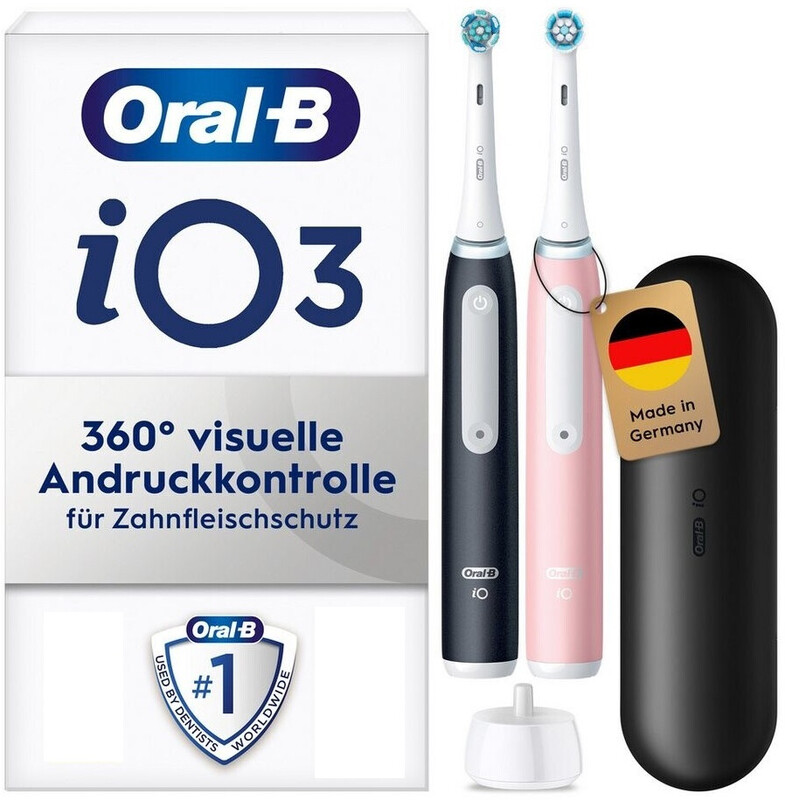 Oral-B iO Series 3 Elektrische Zahnbürste, Electric Toothbrush, Doppelpack, 2 Aufsteckbürsten, 3 Putzmodi für Zahnpflege, Reiseetui, TESTSIEGER Stiftung Warentest (12, 2024), Matt Black, Blush Pink