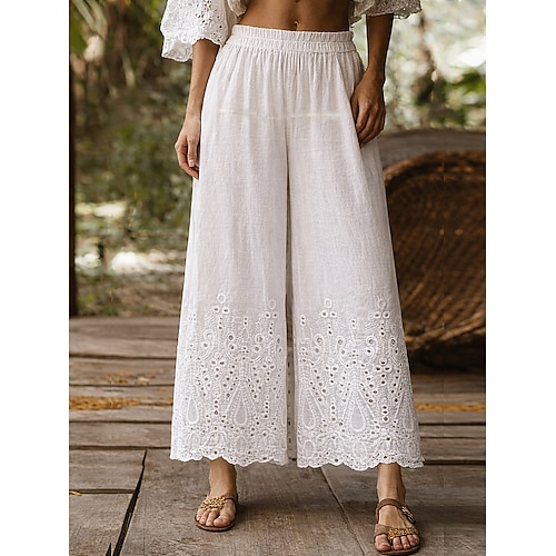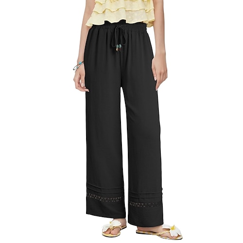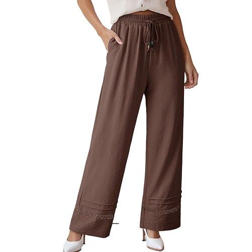 Pantaloni in Lino Sintetico Simile al Cotone per Donna Pantaloni Estivi Pantaloni da Spiaggia Moda Casual Quotidiana Lunghezza Completa Vita Media Solid Color Pizzo Pantaloni Larghi Inelastici Daily