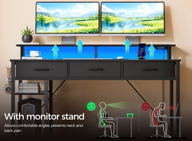 Computer Desk with USB Ports, Power Outlets, LED Strip, Drawers & File Cabinet, Reversible Corner Gaming Desk with Monitor Shelf & Storage for Home Office