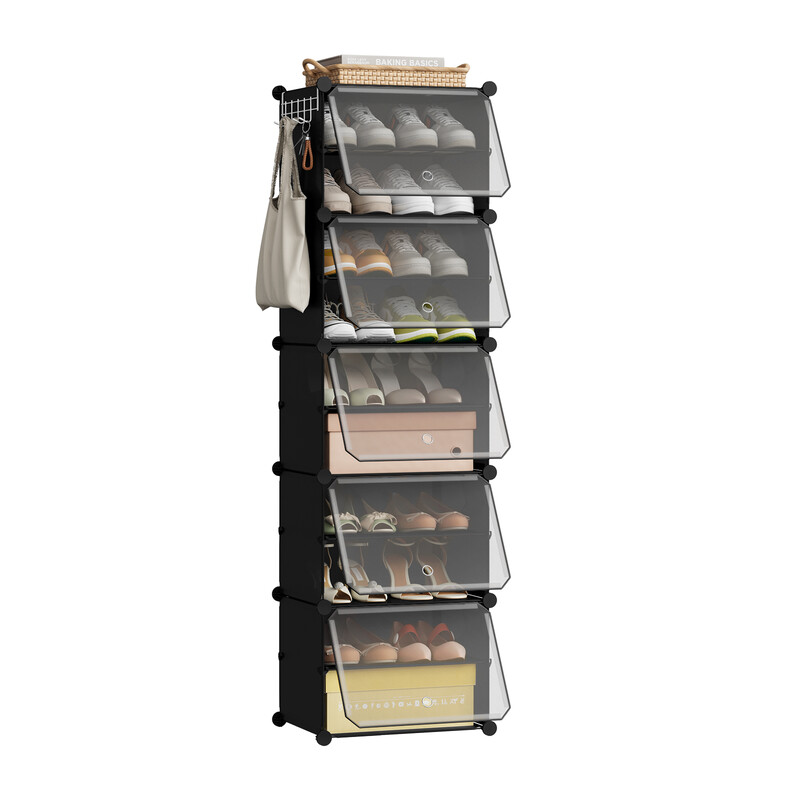 eSituro stapelbarer Würfel-Schuhschrank, modulares DIY-Lagerregal 10 Fächer, mit Türen und Haken, für 10 Paar Schuhe, PP-Platten, mit Hammer, Schwarz