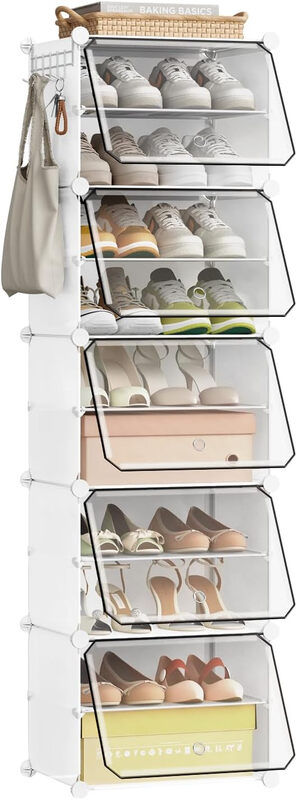 eSituro stapelbarer Würfel-Schuhschrank, modulares DIY-Lagerregal 2x10 Fächer, mit Türen und Haken, für 20 Paar Schuhe, PP-Platten, mit Hammer, Weiß