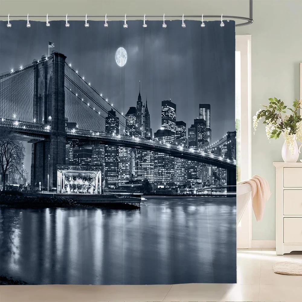 New York Night Landscape Shower Curtain City Bridge Building Bath Curtains 3D Retro Black White Photo Bathroom Decors Curtain