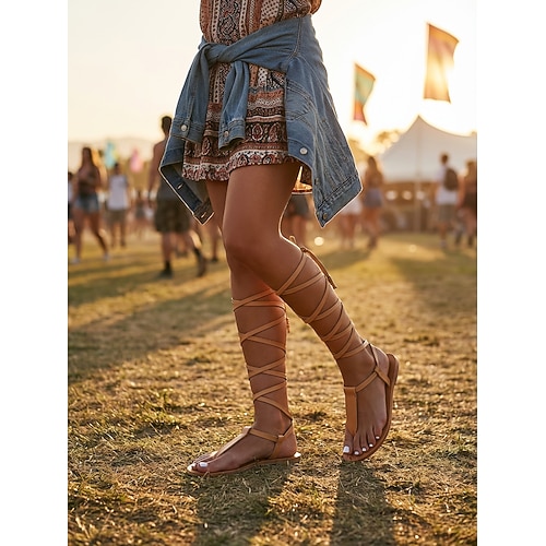 sandali gladiatore neri da donna con lacci alti fino al ginocchio – sandali romani bassi boho con cinturini per l'estate, la spiaggia e l'abbigliamento da festival