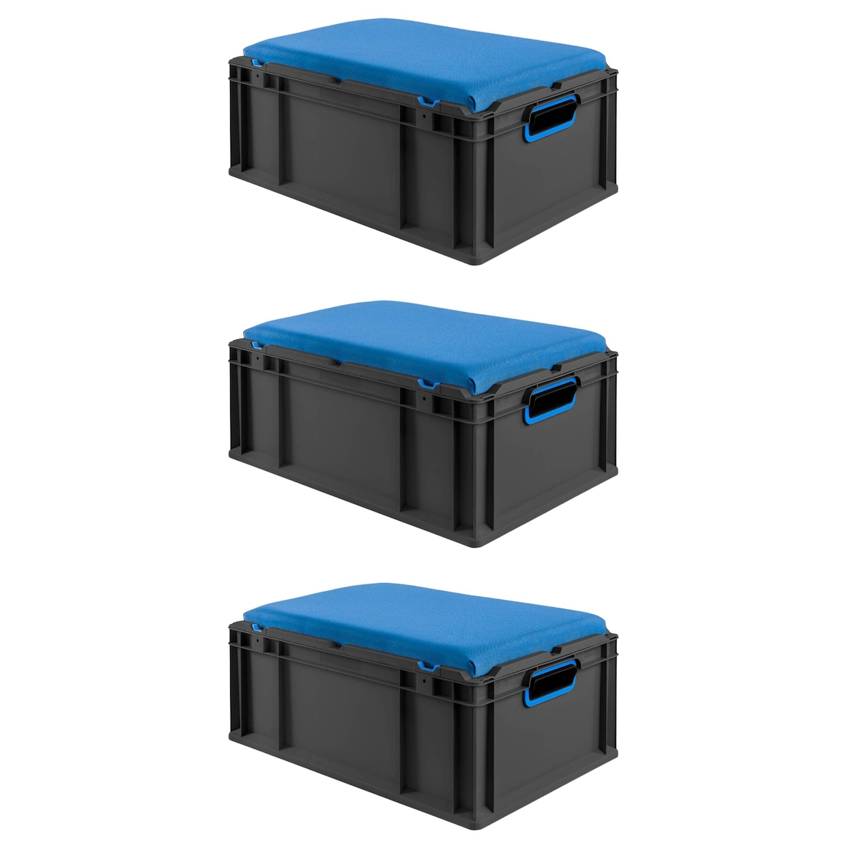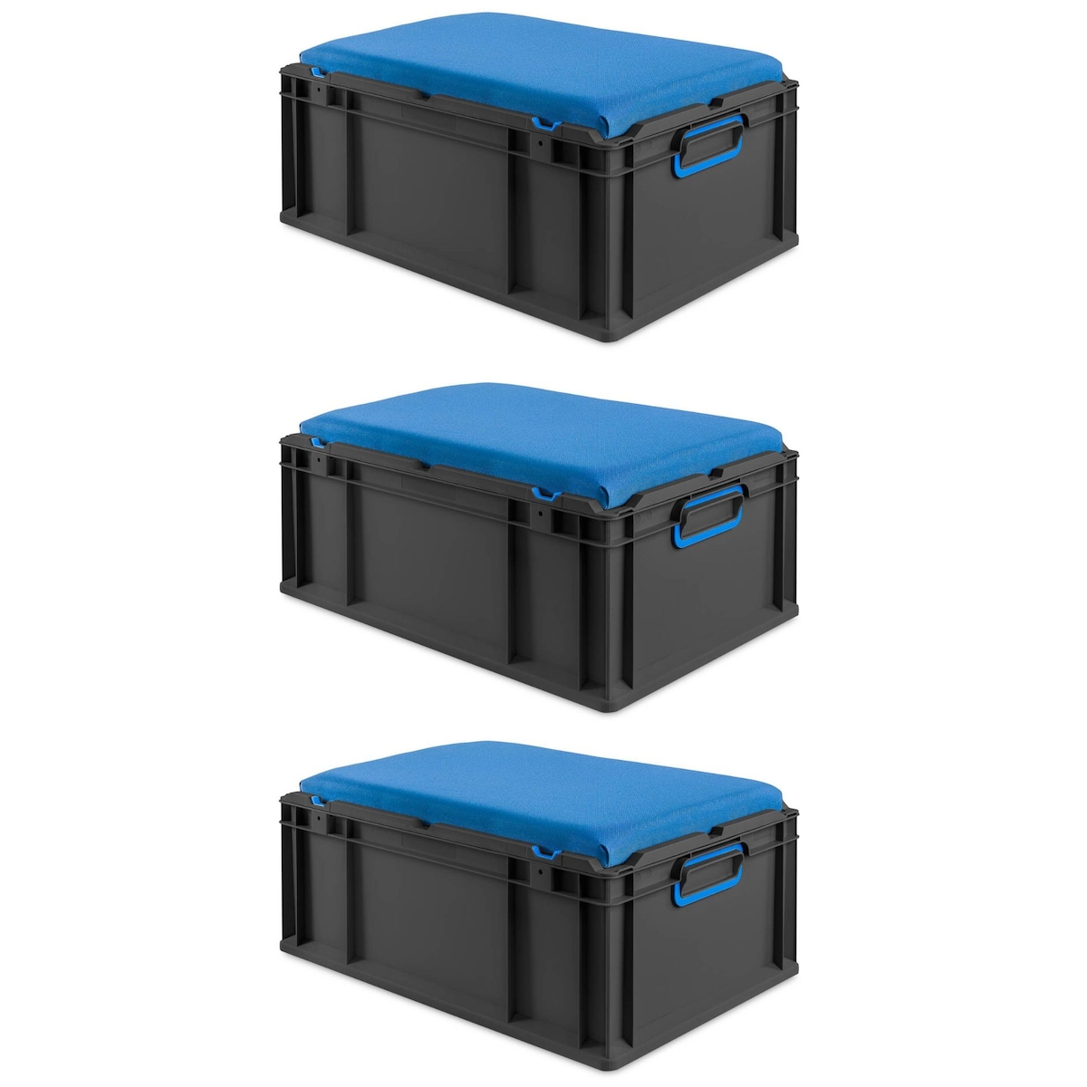 PROREGAL SparSet 3x Eurobox NextGen Seat Box Blau, HxBxT 26,5x40x60cm, 44 Liter, Griffe offen, Schwarz, Eurobehälter, Sitzbox, Transportbox