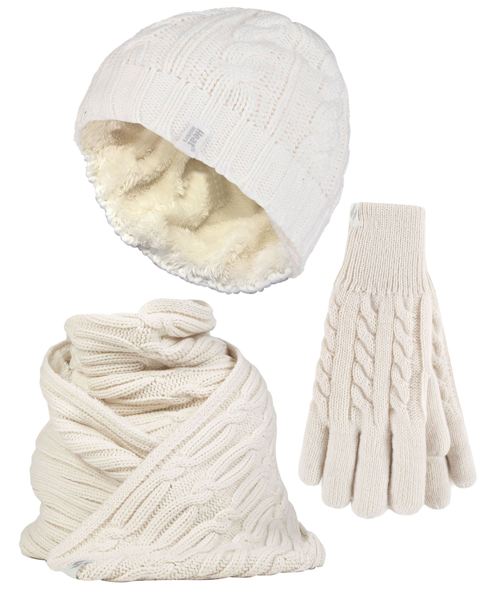 Heat Holders Ladies Knitted Hat Scarf & Gloves Set | | Womens Fleece Lined Thermal Cold Weather Set for Winter - Cream - Size Small/medium