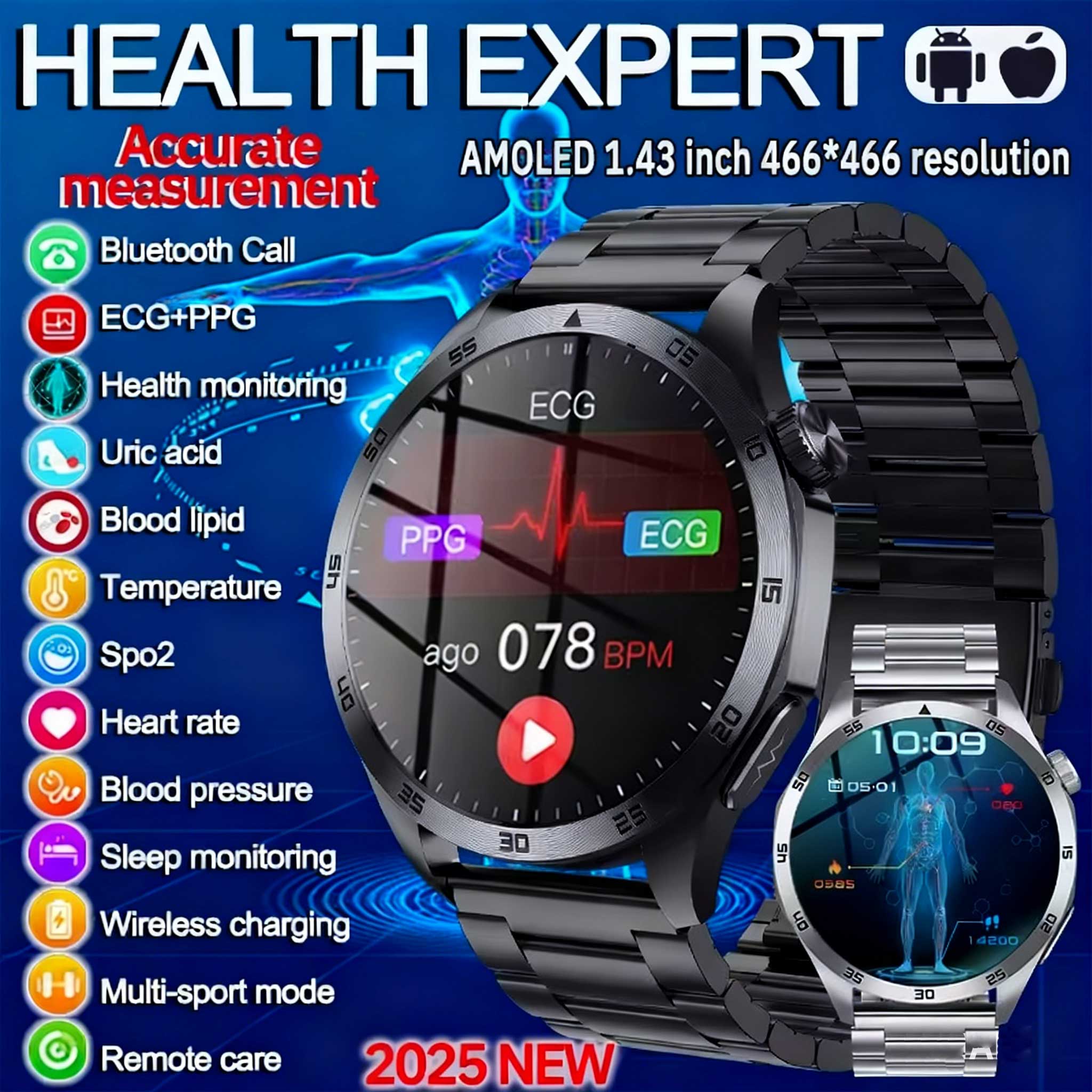 2025 Neu Für XIAOMI Gesundheitsuhr Harnsäure Blutdruck Blutsauerstoff Körperanalyse Körperfett Smartwatch EKG+PPG Uhr Frauen Männer schwarz