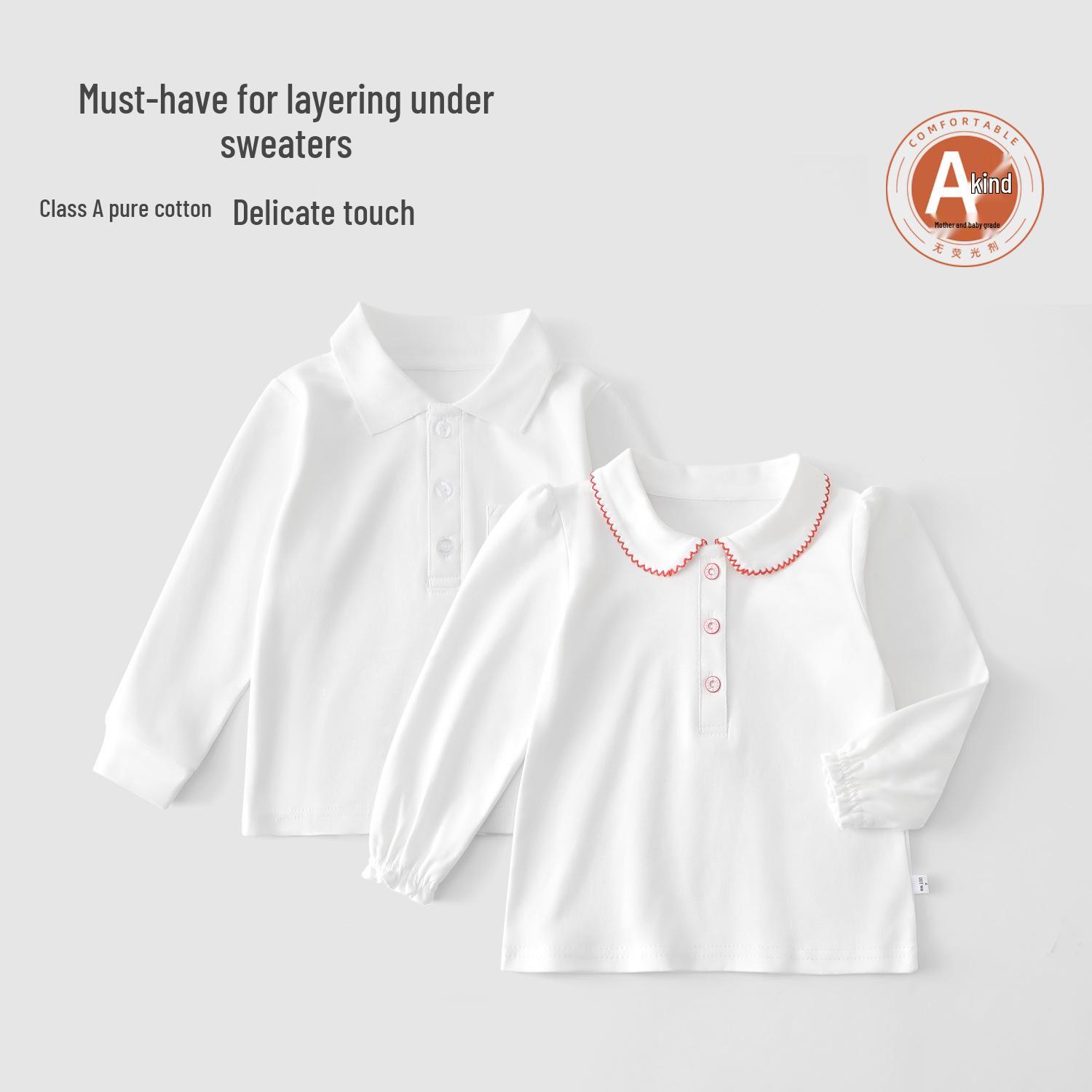 Kids' Plain Cotton Polo Shirt, Long Sleeve, White, for Spring/Autumn, Unisex, Suitable for Older Children. 145-155cm