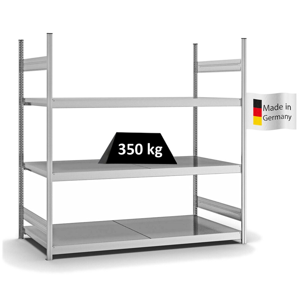 PROREGAL Weitspannregal Stecksystem T-Profil | HxBxT 250x150x80cm | 4 Ebenen | Stahlplatten-Fachboden | Fachlast 350kg | Verzinkt | Lagerregal