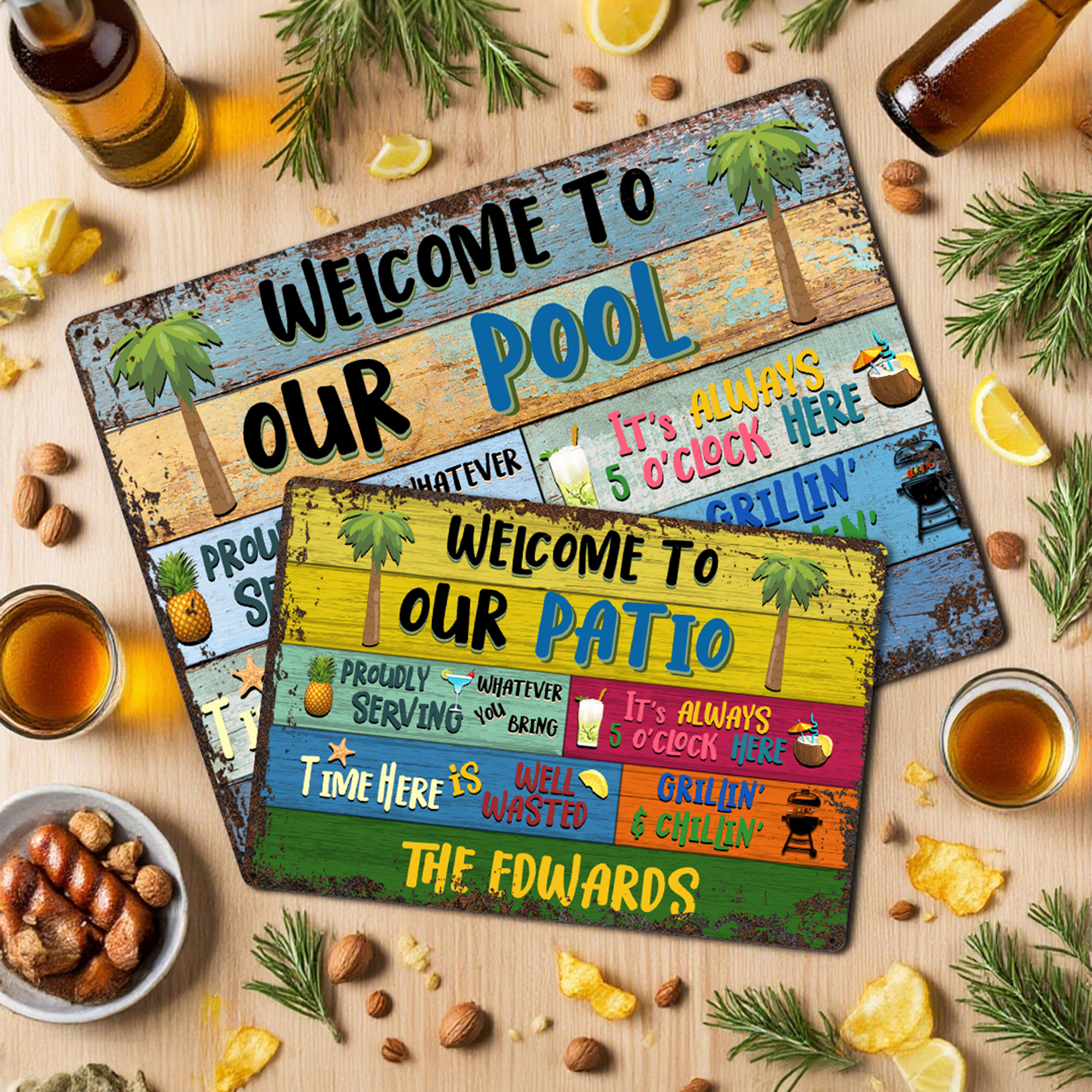 Henkilökohtainen värikäs Tervetuloa grillaus Chilling Metal merkki nimi ja paikka Wall Art Home Decoration Summer Party Housewarming lahja perheelle