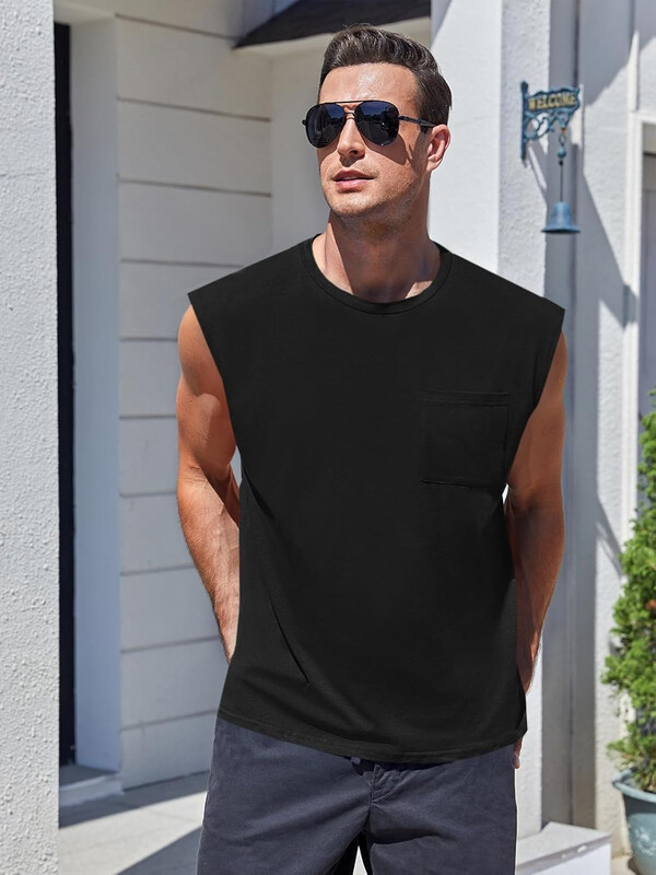 Men's Sleeveless Tank Tops Workout Cut Off Shirts MUSCLE Gym T Shirts with Pocket (black, L)