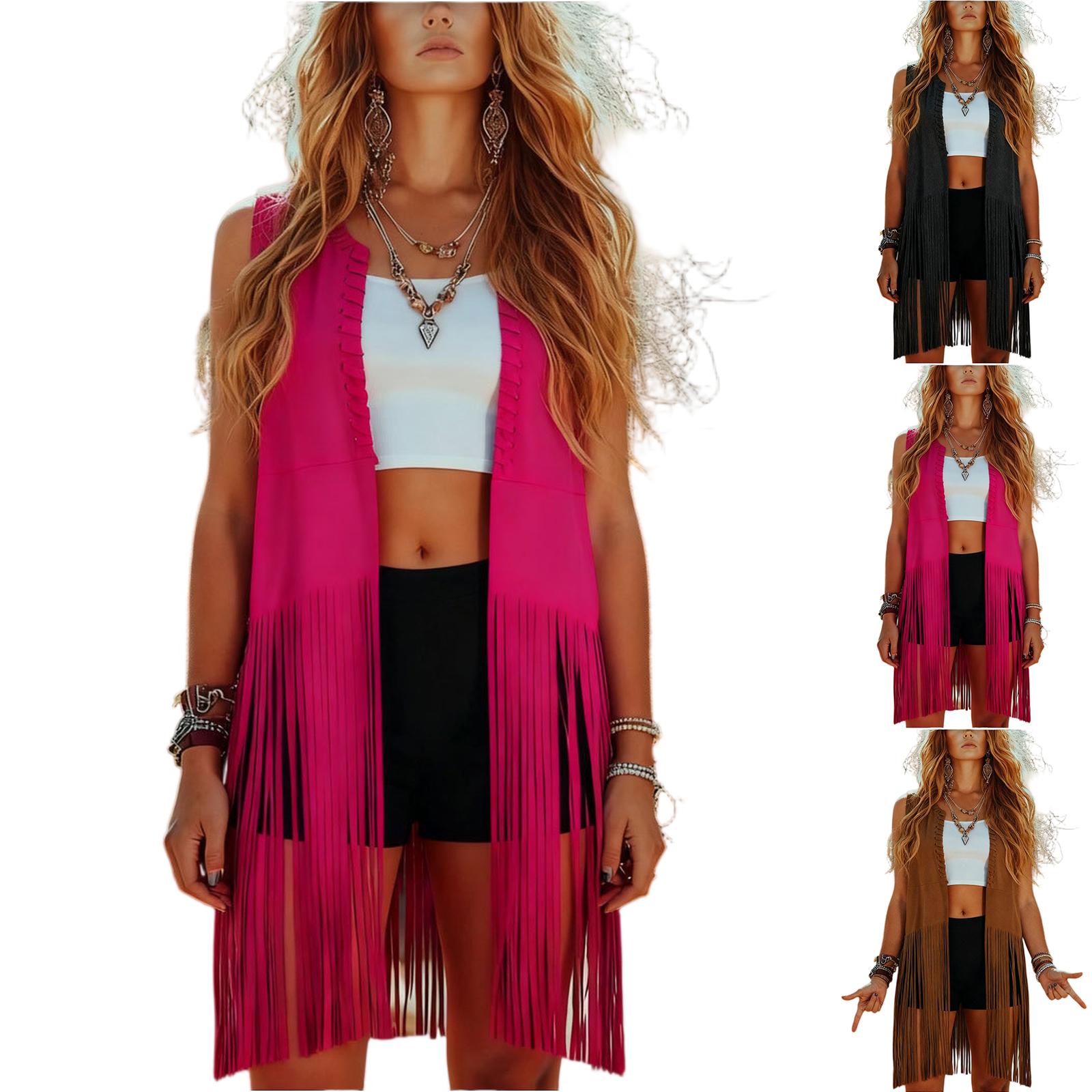 Fashionable Women's Shawl- Fringed Vest, Sleeveless Mid-length Vest. cm hot pink