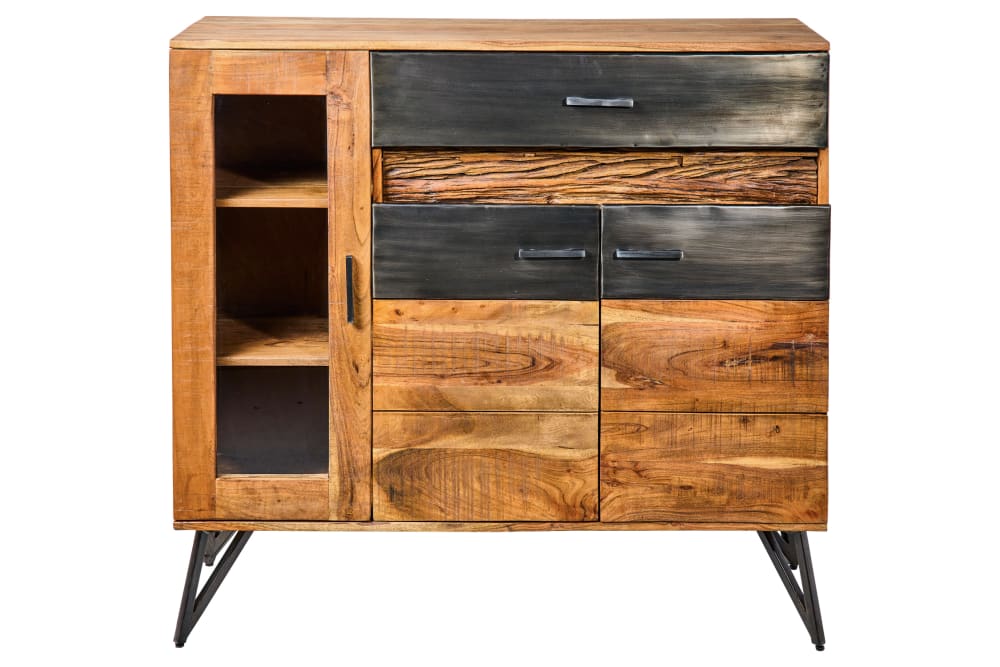 Credenza a led in acacia con vetrina, 2 sportelli e 6 cassetti
