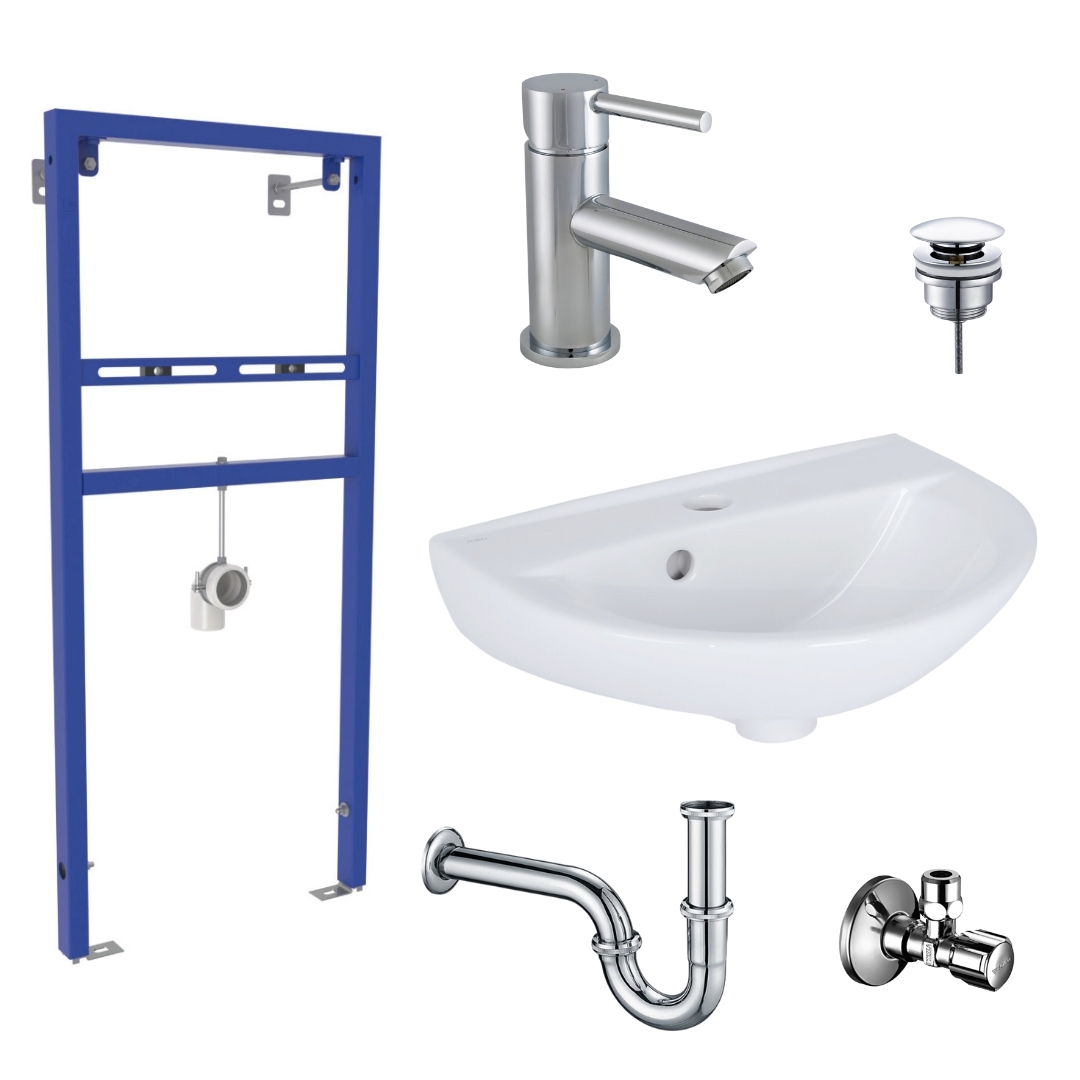 Belvit Waschbecken Komplettset 50 cm Keramik mit Armatur, Vorwandelement, Siphon, Pusher, und SCHELL Eckventil