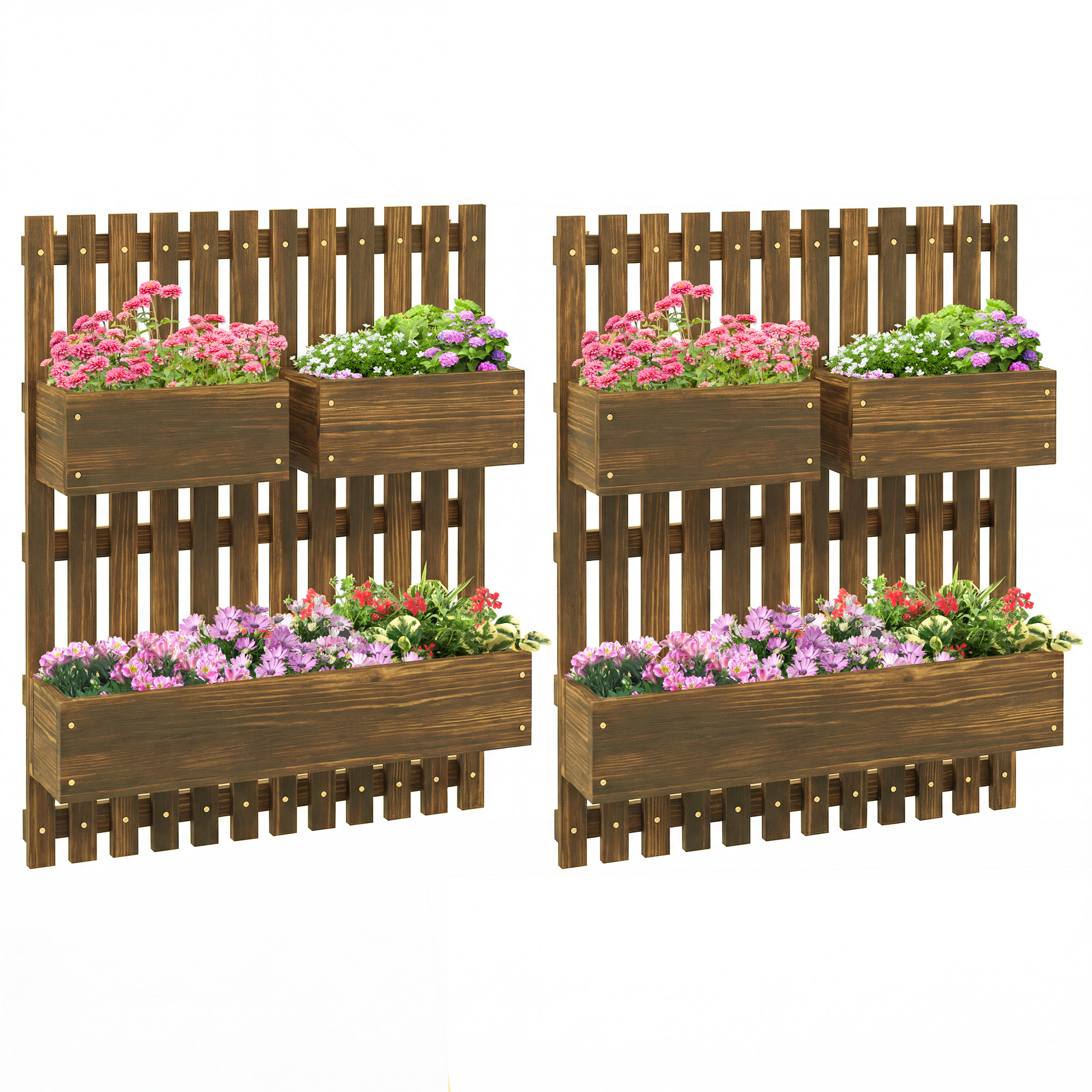 Outsunny Set of 2 Wall-mounted Wooden Garden Planters with Trellis, Drainage Holes and Movable Planter Boxes for Patio, Carbonised
