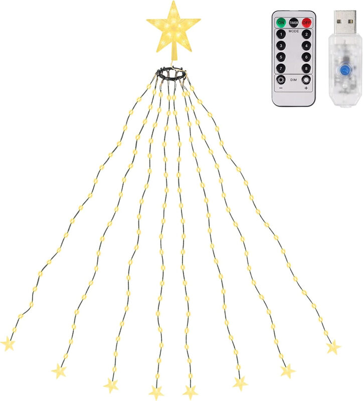 SALCAR 1.5 m Christmas Tree Fairy Lights with Ring, 8 Strings, with Christmas Tree Topper Star, 210 LEDs, Indoor Lighting with 8 Modes, Warm White