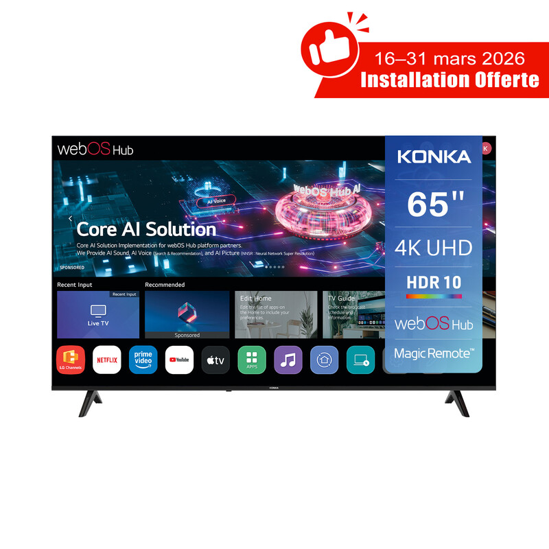KONKA UDG65HK684ANTS Smart TV 65 pouces 4K Ultra HD, système d’exploitation webOS, HDR10, MEMC, Magic Remote et commande vocale IA ThinQ, Airplay 2 et Google Cast, WiFi, Bluetooth, HDMI eARC et installation gratuite