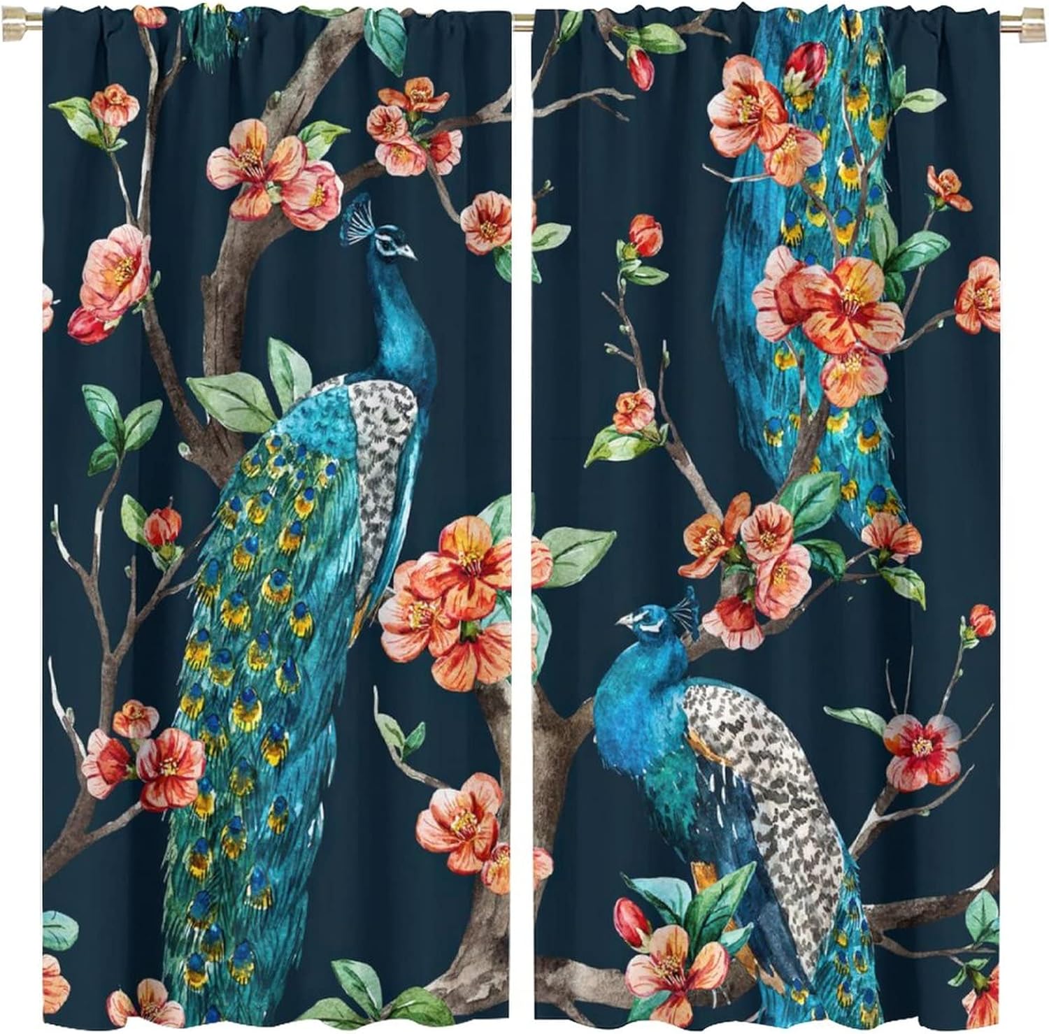 Peacock Blackout Window Curtains Vintage Watercolor Animal Peacock Flowers Print Rod Pocket Window Drapes for Living Room Bedroo